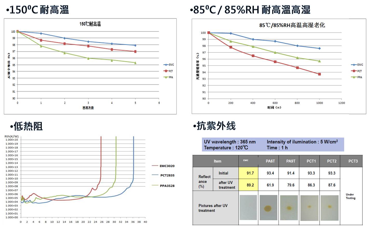 EMC材料在5050封裝系列約3-7瓦的功率值內(nèi)表現(xiàn)優(yōu)異,同時,在更高功率(整燈800lm)級別的應(yīng)用上,EMC封裝材料同樣性能穩(wěn)定。天電即將推出的EMC7070產(chǎn)品極好地滿足了高光通量MR16/GU10、射燈、投光燈、筒燈及球泡燈等應(yīng)用要求。