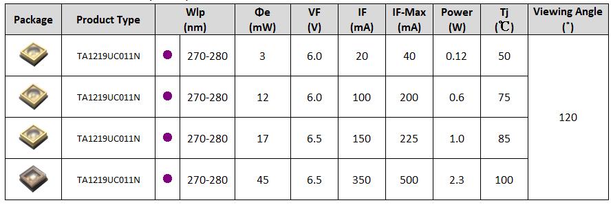 • 高光功率密度UV LED