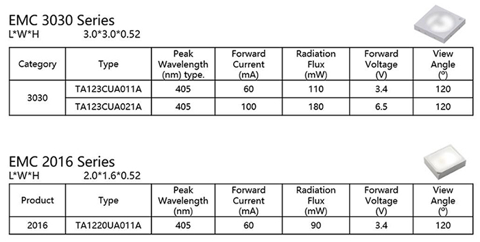天電光電已經(jīng)量產(chǎn)的 UV-A 系列產(chǎn)品,由于支架采用抗 UV 特性極佳的 EMC 材質(zhì),不僅可有效抵御 UV-A 光線的老化,