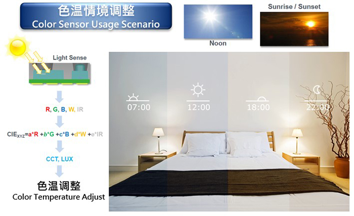 色溫調(diào)節(jié)照明主要是利用R/G/B傳感器依不同時(shí)間段的日光色溫調(diào)整室內(nèi)的照明色系,