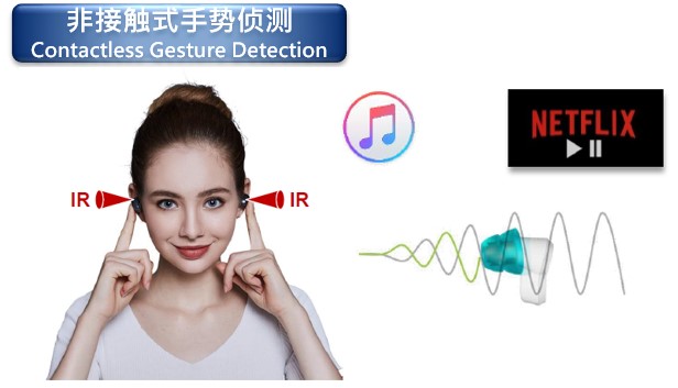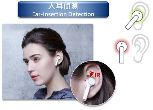(1)入耳偵測(cè):利用紅外感應(yīng)將耳朵作為反射物進(jìn)行藍(lán)芽開關(guān)的驅(qū)動(dòng);
