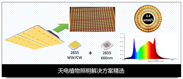以天電高效的C3535-660nm以及3030白光,可以實(shí)現(xiàn)整燈2.6umol/J的大麻燈方案。
